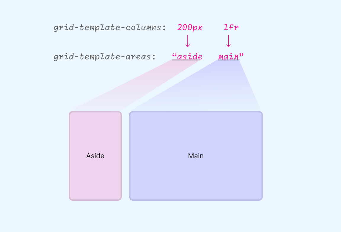 To use CSS grid template areas, we need to define the grid areas via grid-template-areas property. The main things you need to know for now: