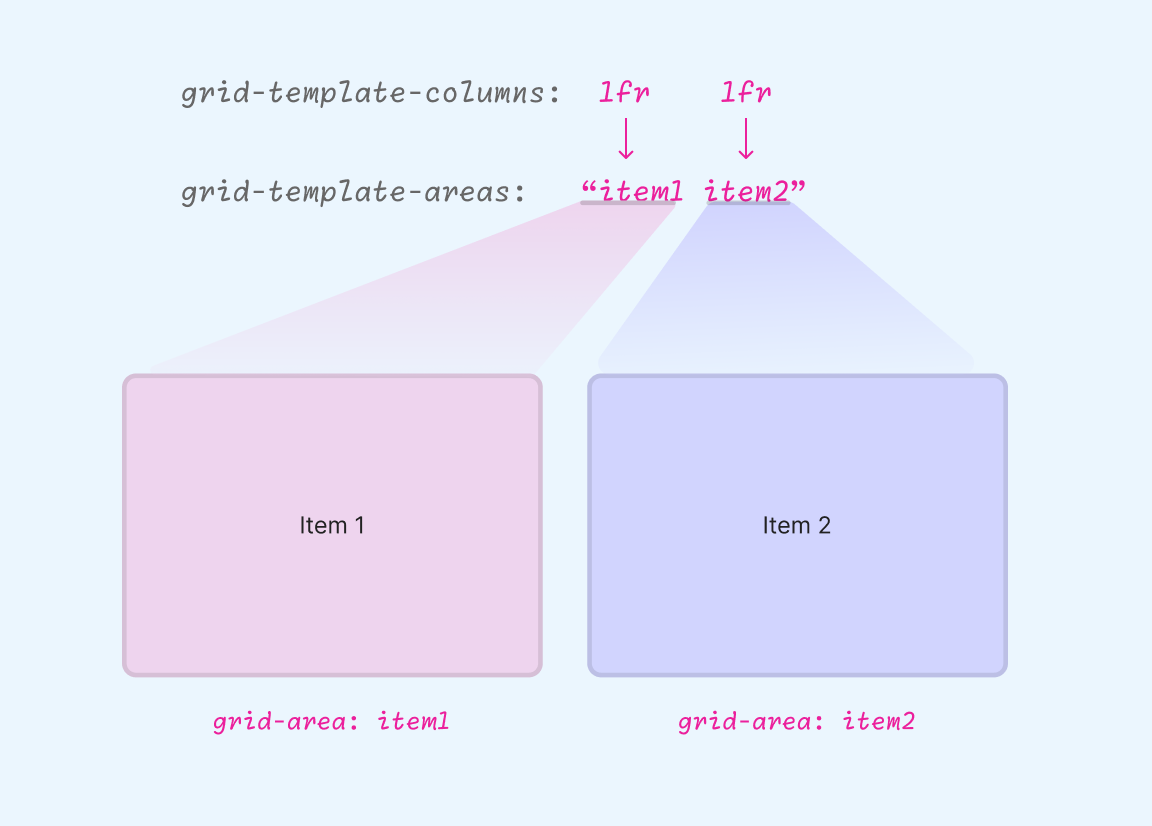 By using a grid-area, it’s like mapping each element in the grid to its designated area. In the following example, see how each column is mapped to a grid area name.