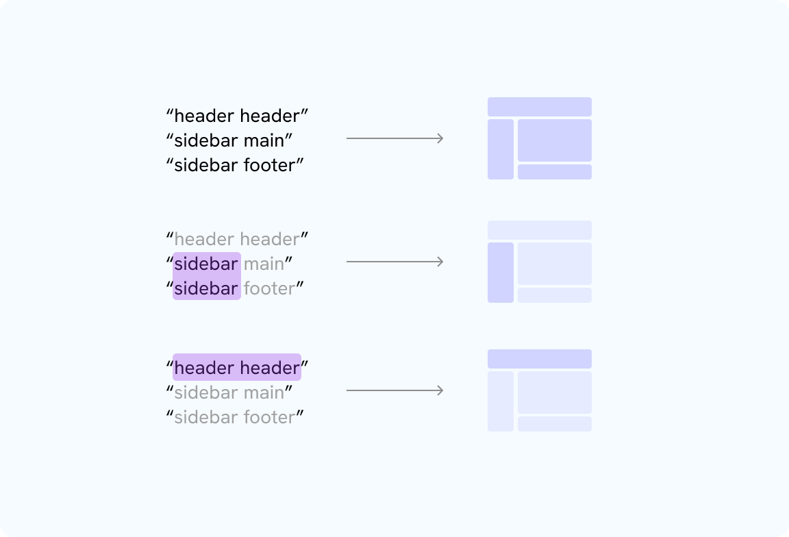 When we add multiple area strings in grid-template-areas, it’s a good practice to stack them into multiple lines as it will help us to visualize them better.