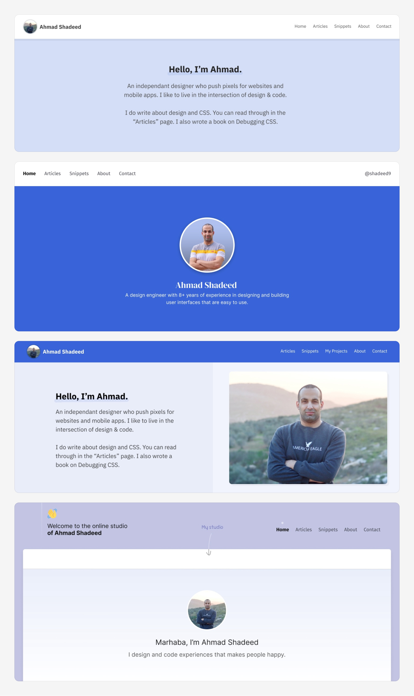 Given that this is a personal website, I didn’t have a branding or a clear logo that I used in the design. However, over the years, I used the blue color as my brand color. Based on that, I started exploring design ideas.