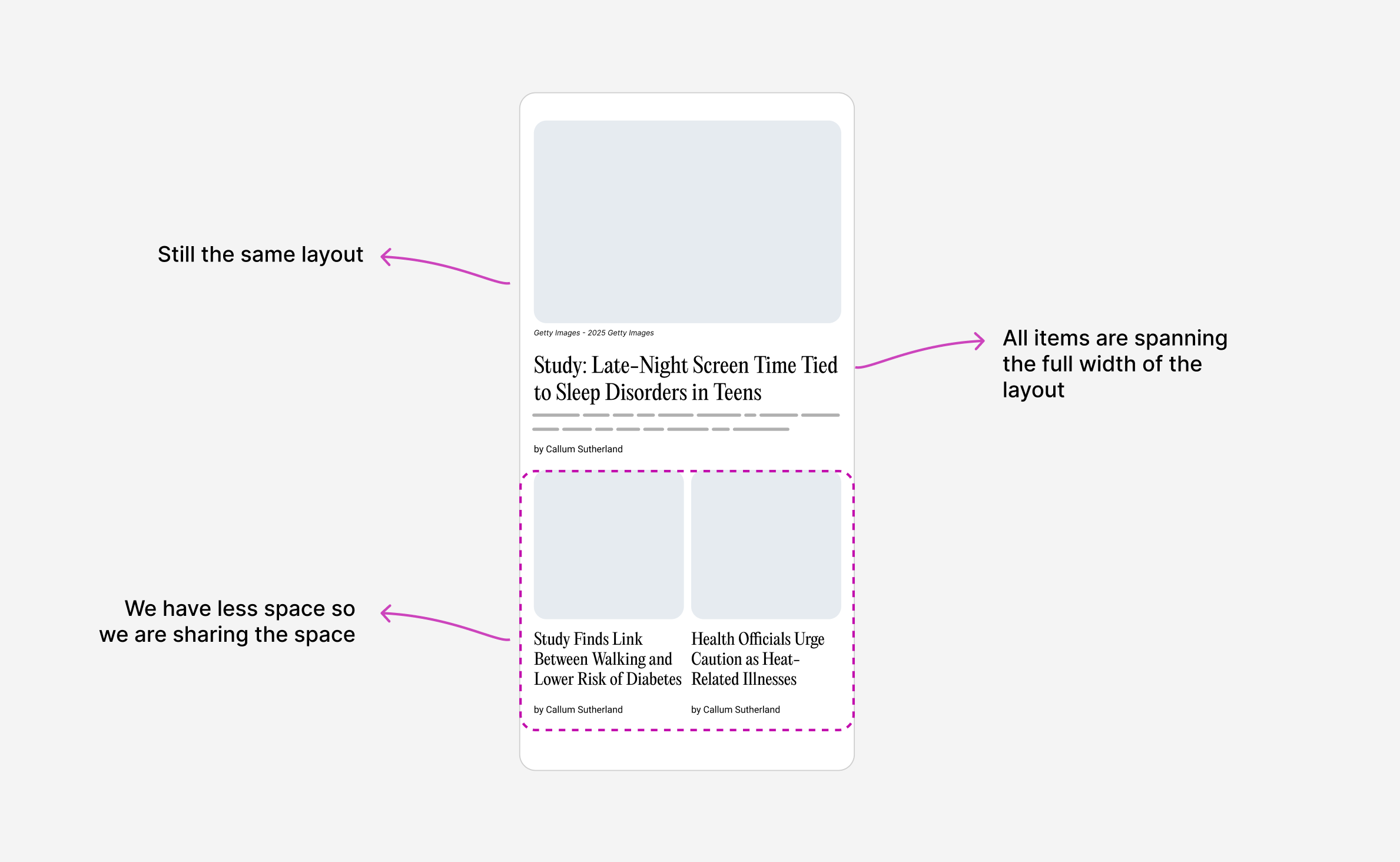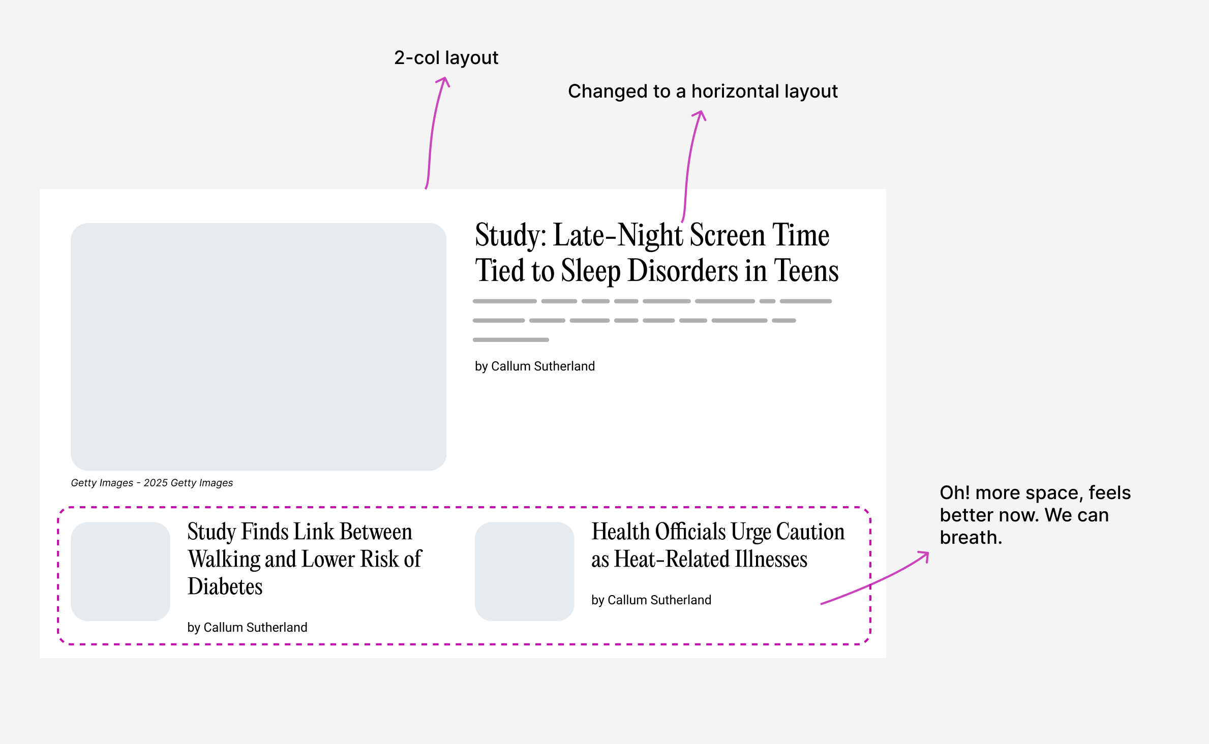 We now have more space, so the 2-col grid works. The other articles span a row each.