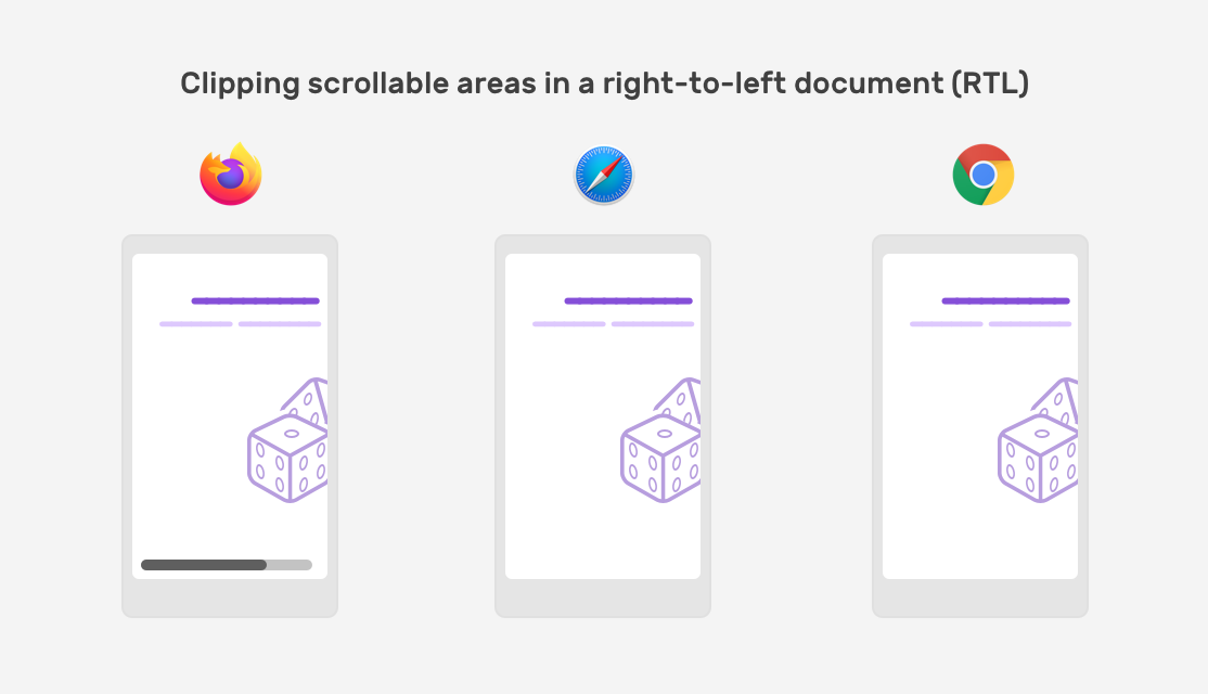 What I found interesting is that Firefox shows a horizontal scrollbar even though the direction is RTL and the element is positioned on the right. Chrome and Safari are displaying the element as expected.