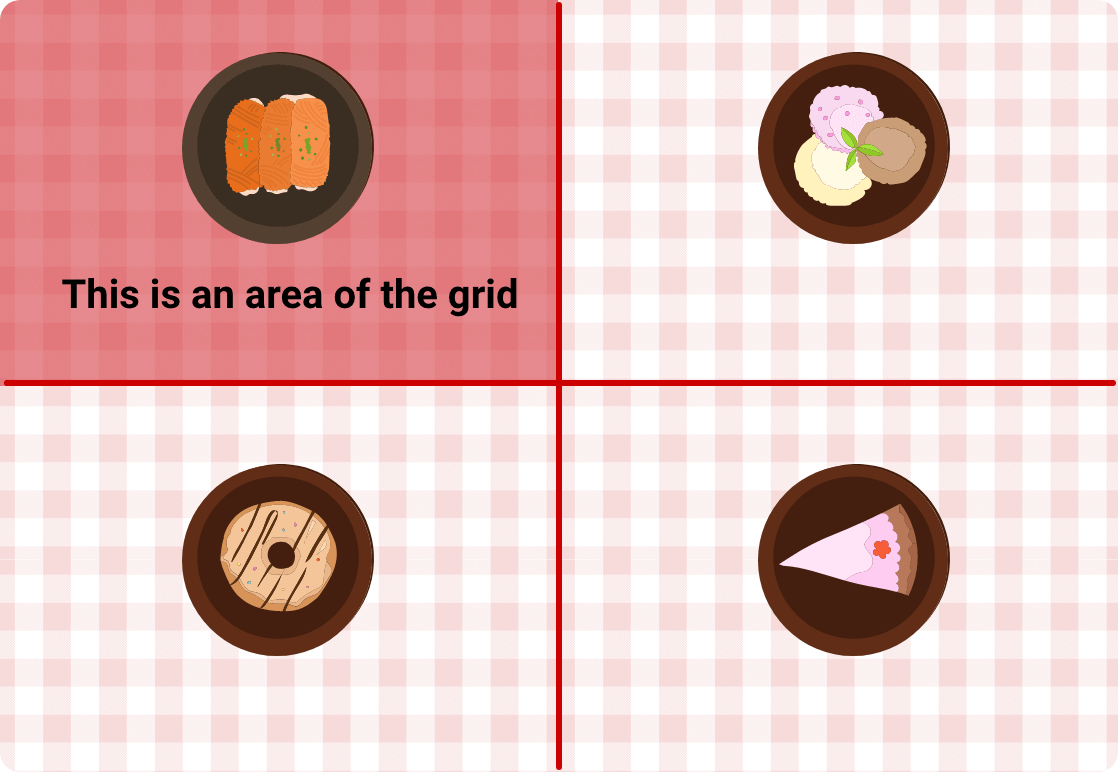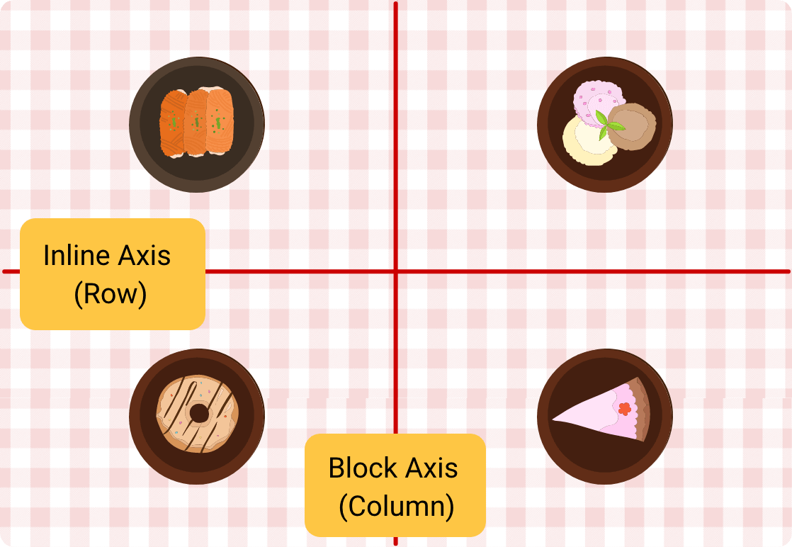 For CSS grid, we have two axes: Inline and block. Those don’t change based on a specific direction. For this section, the plates are desserts.